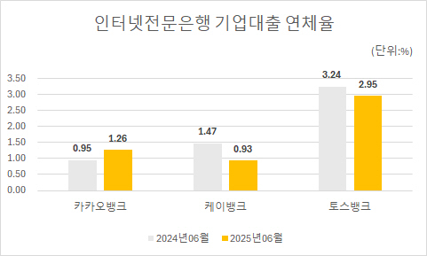 이에 따라 케이뱅크와 토스뱅크는 연체율 관리를 강화하는 모습이다. 케이뱅크의 기업대출 연체율은 지난해 6월 1.47%에서 올해 6월 0.93%로, 토스뱅크는 3.24%에서 2.95%로 떨어졌다.