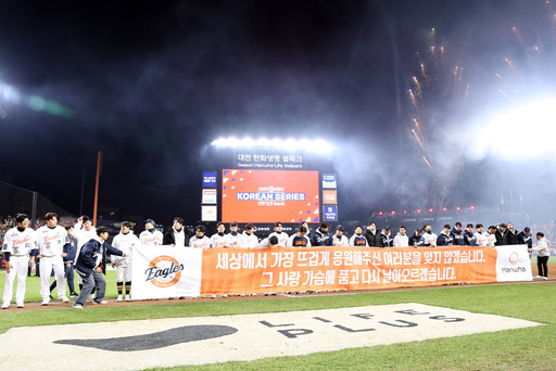 5일 한화그룹에 따르면 김승연 회장은 준우승 직후였던 지난달 31일 '세상에서 가장 뜨겁게 응원해주신 여러분을 잊지 않겠습니다. 그 사랑 가슴에 품고 다시 날아오르겠습니다'라는 현수막을 통해 팬들의 열정과 응원에 감사의 뜻을 전하며 마지막 경기까지 팬 사랑을 실천했다.