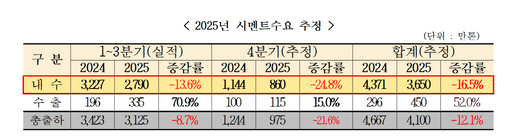 실제로 시멘트협회는 내년 내수 전망치를 올해(3650만t)보다 적은 3600만t으로 내다봤다.