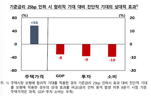금리 인하 후 8분기 시점의 주택가격 상승폭은 합리적 기대를 가정했을 때보다 약 56% 더 커지는 것으로 나왔다. 반대로 국내총생산(GDP)과 투자, 소비의 증가는 8~10% 정도 낮게 나타났다. 같은 완화라도 주택으로 자금과 심리가 쏠리면서 생산적 투자로 가는 부분이 일부 '잡아먹히는(crowding-out)' 구조가 확인된 셈이다.
