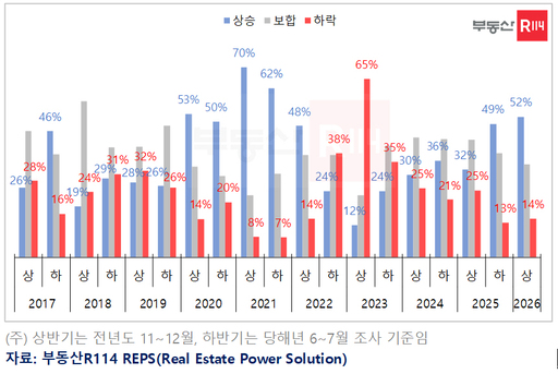 부동산R114가 '2026년 상반기 주택 시장 전망' 설문조사를 실시한 결과에 따르면 응답자의 절반을 초과하는 52%가 주택 매매 가격이 오를 것으로 전망했다. 직전 조사 대비 상승 전망이 3%포인트(p) 더 상승해 문재인 정부 당시인 2021년 하반기 이후 5년여 만에 최고치를 기록했다. 이번 조사는 10·15 대책 발표 이후인 10월 22일부터 11월 2일까지 진행됐다.