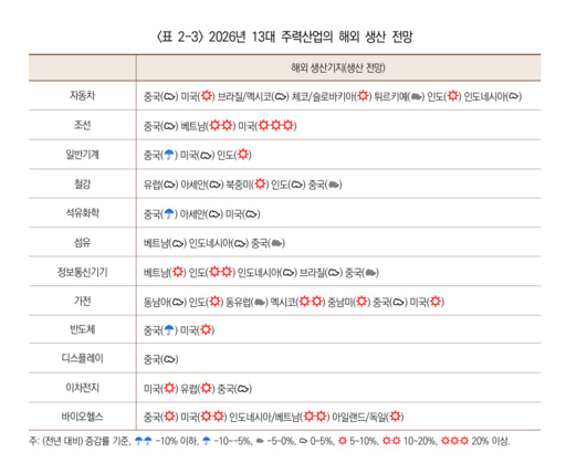 자동차 산업 역시 구조적 압박에서 자유롭지 않다. 미국의 자동차 품목 관세 확정으로 불확실성은 일부 해소됐지만, 고관세 부담과 전기차 수요 둔화, 주요 차종 노후화가 동시에 작용하고 있다. 이차전지 산업은 구조적 성장 산업이라는 평가에도 불구하고, 2026년에는 해외 현지 생산 확대의 영향으로 내수와 수출, 생산 지표가 엇갈리는 흐름이 예상된다. 기업별 대응 속도에 따라 성과 차이는 더욱 커질 전망이다.