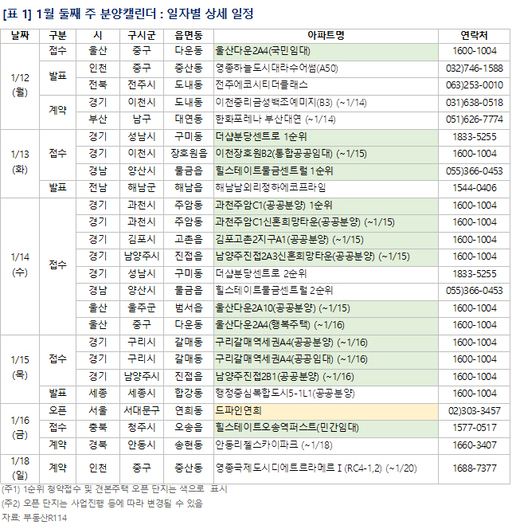 11일 부동산R114에 따르면 1월 둘째주에는 전국 14개 단지 총 7004가구가 공급된다. 이 가운데 일반분양 물량은 1631가구다.