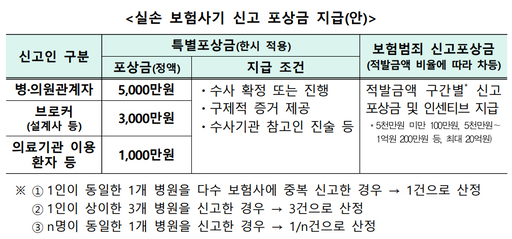 제보 시 구체적인 물증을 제시하고 수사에 적극 협조한 신고자에게는 포상금을 지급한다. 포상금은 신고인이 병·의원 관계자인 경우 최대 5000만원, 브로커인 경우 최대 3000만원, 환자 등 병원 이용자인 경우 최대 1000만원을 지급한다. 생·손보협회에서 운영하는 '보험범죄 신고포상금'도 추가 지급한다.