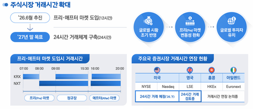 한국거래소는 국내 주식시장의 유동성이 빠져나가고 있다는 점을 짚고, 글로벌 자본시장 거래시간 확대 흐름에 대응하겠다는 입장이다. 현재 뉴욕 증권거래소 아르카(NYSE Arca)는 16시간 거래를 진행 중이고, 하반기에는 나스닥과 함께 24시간 거래서비스를 개시할 계획이다. 또한, 런던, 홍콩거래소에서도 24시간 거래체제 도입을 검토하고 있는 상황이다.