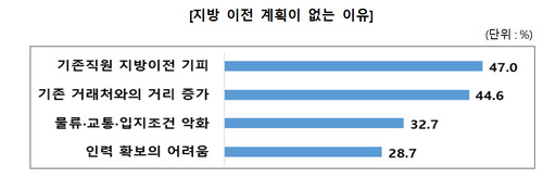 수도권 기업이 지역 이전을 계획하지 않는 이유 1순위는 '기존 직원의 지방 이전 기피(47.0%)'가 차지했다. 이외에 ▲기존 거래처와의 거리 증가(44.6%) ▲물류·교통·입지 조건 악화(32.7%) ▲인력 확보의 어려움(28.7%) 순이었다. 인력 유지 및 기존 사업 네트워크 단절에 대한 우려가 지방 이전의 장벽으로 작용하고 있는 것으로 풀이된다.