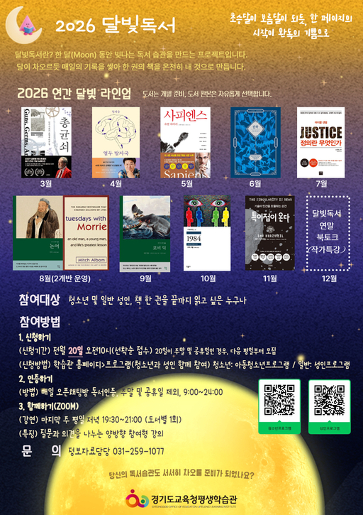 오는 3월부터 12월까지 운영되는 '달빛독서'는 매월 한 권의 주제 도서를 선정해 한 달간 읽고 온라인을 통해 독서 경험과 생각을 나누는 프로그램으로 개인 중심의 독서를 넘어 소통하는 독서 문화를 확산하기 위해 마련됐다.