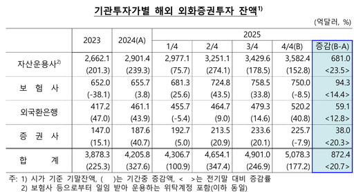 4일 한국은행이 발표한 '2025년중 주요 기관투자가의 외화증권투자 동향'에 따르면 2025년 말 우리나라 주요 기관투자가(자산운용사·외국환은행·보험사·증권사)의 외화증권투자 잔액(시가기준)은 5078억3000만달러로 전년 말 대비 872억4000만달러 증가했다. 증가율은 20.7%다.