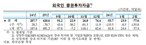 '2월 국제금융·외환시장 동향'에 따르면 지난달 외국인의 국내 주식 자금 유출 규모는 135억 달러로 집계돼 역대 최대치를 기록했다. 이는 코로나19 충격으로 글로벌 금융시장이 급락했던 2020년 3월(110억4000만 달러)을 넘어선 수준이다. 중동 지역의 지정학적 긴장이 더해지면서 외국인 자금 이탈 흐름이 당분간 이어질 가능성이 있다는 분석이 나온다.