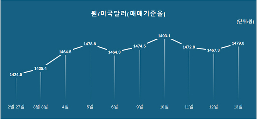 15일 서울 외국환 중개에 따르면 지난 13일 원·달러 환율은 1479.80원에 거래를 마쳤다. 원·달러 환율은 중동전쟁이 일어나기 전(2월 27일) 1424.50원에서 이달 13일 1479.80원으로 55원 올랐다.