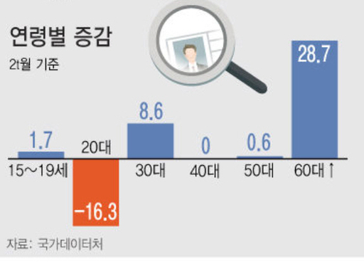 연령대별로 60세 이상(+28만7000명), 30대(+8만6000명), 50대(+6000명) 등에서는 취업자가 증가한 반면, 20대(-16만3000명)에서는 뒷걸음질했다. 40대는 변동 없이 유지됐다.