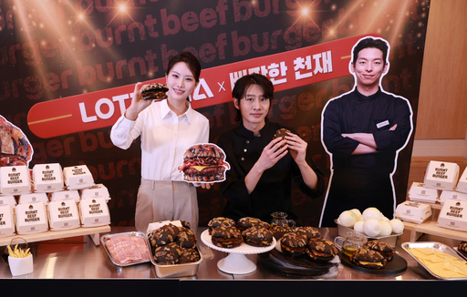 17일 서울 용산구 롯데리아 숙대입구역점에서 모델들이 롯데리아와 '삐딱한 천재' 이찬양 셰프가 협업해 출시한 삐딱한 버거 '번트 비프버거'를 출시했다.