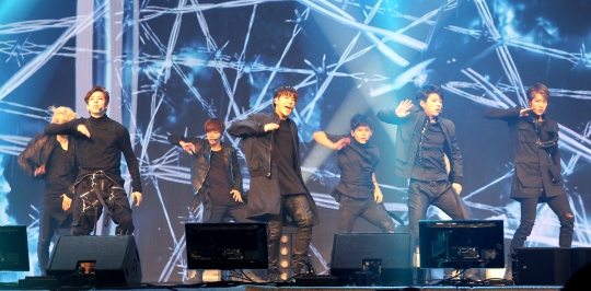 그룹 인피니트가 19일 오후 서울 한남동 블루스퀘어 삼성카드홀에서 열린 6번째 미니앨범 '인피니트 온리' 쇼케이스에 참석해 신곡 '태풍'의 무대를 선보이고 있다./손진영 기자 son@