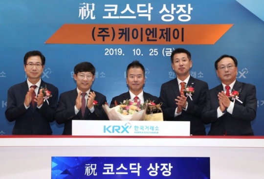 정운수 한국거래소 코스닥시장본부장이 지난 25일 케이엔제이 코스닥 상장 기념식에서 심호섭 케이엔제이 대표이사,김상태 미래에셋대우 IB총괄 사장 등 관계자들과 함께 기념촬영을 하고 있다. / 사진 한국거래소