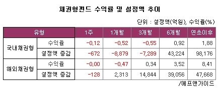 이에 따라 자금 이탈이 가파르다. 연 초 이후 시중 자금을 무섭게 빨아들이면서 설정액이 9조 8176억원 늘어났지만 최근 3개월을 기준으로 자산은 순유출세로 접어들었다. 최근 한 달 동안에만 설정액은 8879억원 줄었다. 순유입세를 유지하던 해외채권형 펀드에서도 최근 일주일만에 순유출세로 전환, 설정액이 128억원 줄어들었다.
