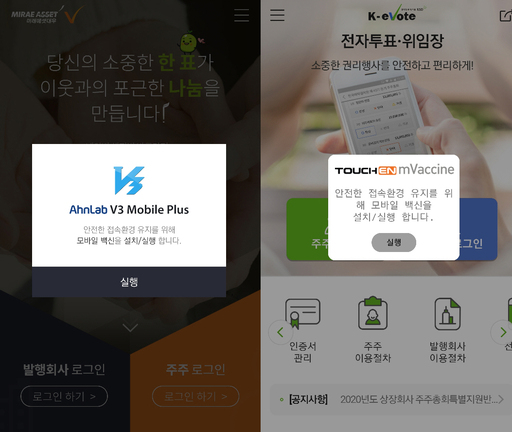 휴대폰으로 접속할 경우 미래에셋대우는 '안랩', 예탁결제원은 '어치엔 엠백신'을 설치해야 가입이 가능하다. 예탁결제원과 달리 증권사는 공인인증서 없이 가입을 가능하게 했지만 이 역시도 다른 인증앱(App)을 통해야 한다.