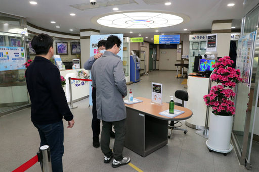 장흥군은 출입구를 청사 정문으로 일원화하고 모든 방문객들에 대해 체온 측정과 손 소독을 실시하고 있다.