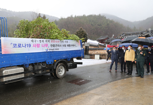 장흥군의 군목인 동백나무를 대구로 보내 코로나19 완전한 극복을 기원하는 군민들의 응원 메시지도 함께 전했다.