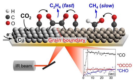 이에 연구팀은 적외선분광학 분석법을 적용해 나노구리입자 촉매 표면의 이산화탄소 전환 반응에서 일산화탄소 외에 에틸렌이 되는 과정의 중간체(OCCOH)와 메탄을 생성하는 중간체(CHO)를 각각 관찰했다.