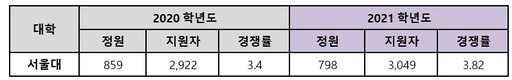 전국적으로 정시 전형 경쟁률 하락 기조가 예상되는 가운데 서울대가 예상을 뒤집으며 '역주행'하고 있다. 서울대 2021학년도 대입 정시 경쟁률은 3.82대 1로 나타나 전년도 보다 상승했다.