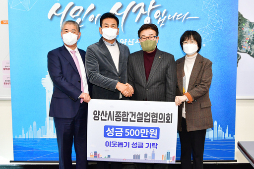 양산시종합건설업협의회에서 27일 이웃돕기 성금 500만원을 기탁했다. 이날 기탁식에 참석한 김병곤 회장은 "겨울철 복지사각지대에 놓인 이웃들에게 조금이나마 마음을 전달할 수 있는 기회를 갖게 되어 뜻깊고 따뜻한 연말이 되길 바란다"고 전했다.