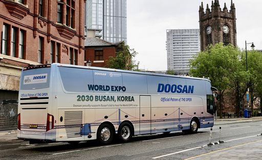 또 두산은 갤러리 뿐 아니라 맨체스터와 리버풀 등의 현지 주민과 관광객을 대상으로 부산엑스포를 알리기 위해 브랜딩 버스를 운행했다. 부산 광안대교 이미지, 부산엑스포 엠블럼, 유치 기원 문구 등으로 전체를 랩핑한 브랜딩 버스는 디 오픈 기간 동안 맨체스터 시내에서부터 리버풀 대회장까지 매일 10여회 왕복 운행하며 부산엑스포 유치 지원 메시지를 노출했다.