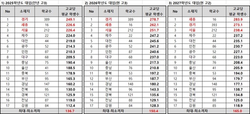 현재 고2 학생인 2027학년도에는 지역별 학교당 평균 학생 수가 세종 283.9명, 경기 273.1명, 서울 238.4명으로 순으로 높게 형성되면서, 가장 적은 강원 지역(118.9명)과 격차가 165명까지 벌어진다.