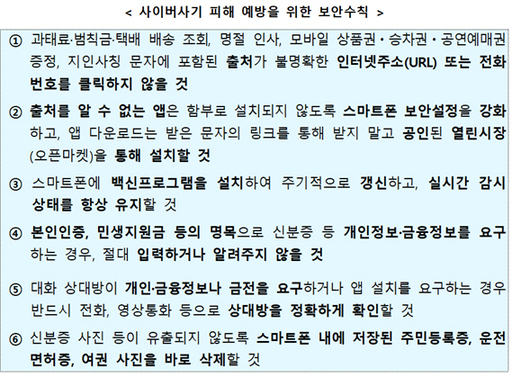 28일 금융위원회, 금융감독원, 과학기술정보통신부, 방송통신위원회, 경찰청, 한국인터넷진흥원 등 유관기관은 추석 연휴를 앞두고 전기통신금융사기 피해 예방·대응 수칙을 안내했다. 다양화·고도화되는 사이버사기에 대한 국민 피해를 사전에 예방하기 위해 보안 수칙을 생활화해야 한다는 방침에서다.