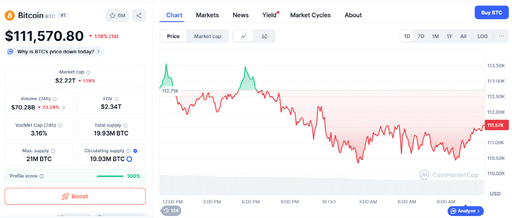 16일 가상자산 시황중계사이트 코인마켓캡에 따르면 '가상자산 대장주' 비트코인은 이날 정오께 전일보다 1.18% 내린 1BTC당 11만1570달러에 거래됐다. 앞서 비트코인은 지난 6일 장중 12만6198달러까지 올라 사상 최고치를 경신했는데, 열흘 만에 약 12% 가량 하락했다.