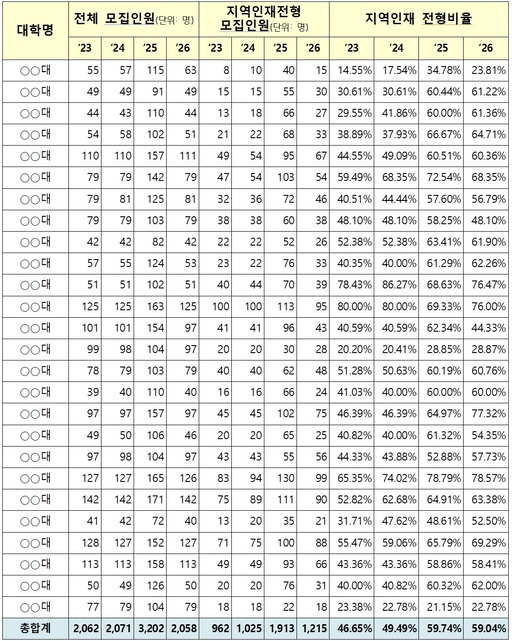 교육부가 제출한 국정감사 자료에 따르면, 2026학년도 의과대학 지역인재전형 비율이 2025학년도 대비 감소한 대학은 12곳, 2024학년도보다 줄어든 대학은 2곳으로 나타났다. 특히 이 중 절반 이상이 정부가 추진하는 '글로컬대학'이었다.