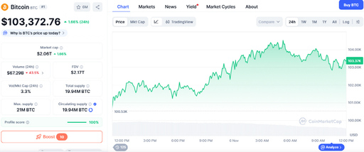 가상자산 시황정보사이트 코인마켓캡에 따르면 '가상자산 대장주' 비트코인은 6일 정오께 1BTC당 10만3372달러에 거래됐다. 24시간 전보다 1.66% 올랐다. 비트코인 가격이 올해 6월 이후 처음으로 10만 달러 아래로 내린 전일의 하락분을 대부분 만회했지만, 지난달 7일 기록한 사상 최고가 12만6000달러와 비교해서는 한 달여 만에 18.4% 하락한 수준이다.