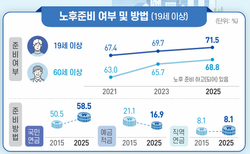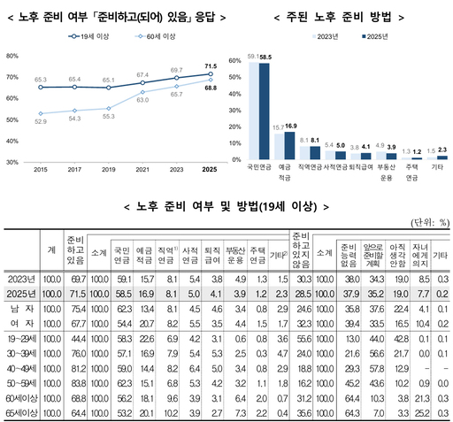 중장년 세대 응답자 가운데 80% 이상(40~49세 81.2%·50~59세 83.8%)은 경제적으로 노후를 준비하고 있다고 답변했지만, 주된 노후 준비 방법은 국민연금·직역연금 등 공적연금이 70% 이상을 차지했다. 국회 예정처는 지난 2023년 63세 이상 연금소득자의 월 평균 연금소득을 80만원 전후로 집계했는데, 이는 같은해 1인 가구의 최저생계비인 134만원에 미치지 못한다.