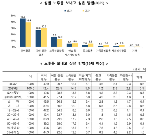 12일 국가데이터처(옛 통계청)가 발표한 '2025년 사회조사'에 따르면 만 19세 이상 국민 가운데 42.4%는 노후를 보내고 싶은 방법(중복응답 없음)으로 '취미활동'을 꼽았다. 여행 및 관광은 28.5%로 뒤를 이었고, 학습 및 자기개발 활동은 5.6%를 기록했다. 노후에도 소득 창출 활동에 참여하고 싶다는 응답도 14.3%에 달했다.