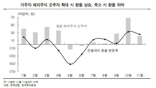 문다운 한국투자증권 연구원은 "내국인 해외증권투자가 급격히 확대되면서 시장에는 환율 상승압력에 대한 기대가 자리잡고 있다"며 "이때 수출 업체들은 단기 환율 고점에서 달러를 매도하기 위해 가지고 있는 달러를 보유하려는 유인이 확대된다"고 했다.