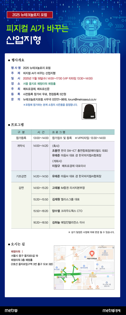<메트로신문> 과 <메트로경제> 는 19일 오후 2시부터 서울 중구 페럼타워 3층 페럼홀에서 '2025 뉴테크놀로지 포럼'을 개최한다. 올해 포럼의 주제는 '피지컬 AI가 바꾸는 산업 지형'이다. 국내 산업계가 마주한 기술 전환의 방향성과 각 분야별 대응 전략을 공유하는 자리로 구성된다. 메트로경제> 메트로신문>
