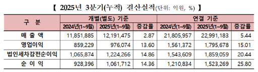 18일 한국거래소에 발표한 '12월 결산법인 2025년 3분기 결산실적'에 따르면 코스피 12월 결산 상장법인 639개사(금융업, 분할·합병, 감사의견 비적정 회사 등 70곳 제외)의 3분기 누적 연결기준 매출액은 2299조1183억원으로 5.44%(118조5226) 소폭 증가했다. 다만 영업이익은 179조5678억원으로 전년 동기(156조1372억원) 대비 15.01%, 순이익은 지난해 121조834억원보다 25.80% 성장한 152조3269억원을 기록하며 대폭 늘어났다.