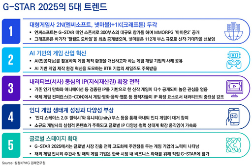 삼정KPMG는 18일 'G-STARS 2025로 본 게임 산업의 미래' 보고서를 발간하며 올해 G-STAR에서 나타난 핵심 트렌드를 분석했다. 보고서는 ▲AI 기반 개발·운영 혁신 ▲내러티브(IP) 중심 확장 전략 ▲대형사 '2N(엔씨소프트·넷마블)+1K(크래프톤)' 존재감 강화 ▲인디 생태계 확대 ▲글로벌 시장 협력 강화 등을 주요 키워드로 제시했다.