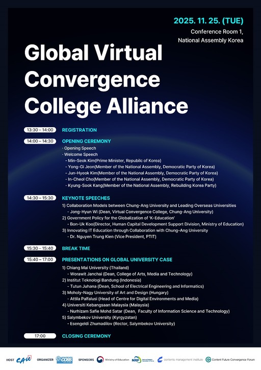 위정현 중앙대 가상융합대학 학장은 "한국은 IT와 콘텐츠 분야에서 강한 경쟁력을 보유하고 있으며, 이에 기반한 융합 교육은 전 세계 대학들의 관심이 가장 높은 분야"라며 "실감미디어·AI 기반 K-교육 모델을 체계적으로 확산해 한국이 미래 고등교육 혁신을 선도할 수 있도록 노력하겠다"고 말했다.