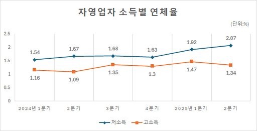 저소득 자영업자의 대출잔액은 2분기 기준 141조3000억원으로 전 분기와 비교해 3조8000억원 늘었다. 반면 고소득 자영업자 대출잔액은 2분기 738조5000억원으로 전 분기와 비교해 7000억원 줄었다. 연체율도 저소득 자영업자는 1.92%→2.07%로 상승한 반면 고소득 자영업자는 1.47%→1.34%로 감소했다.