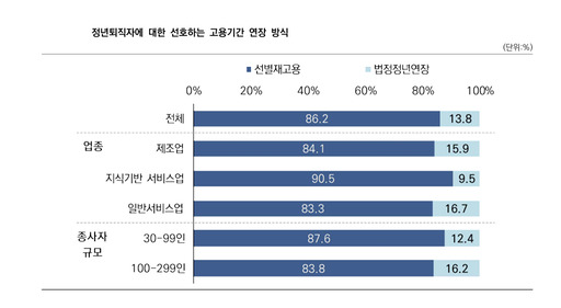 반면 '법정 정년 연장'을 희망한 기업은 13.8%에 불과했다. 직무 및 성과 등에 따라 고용 연장 여부를 정하는 선별재고용은 법정 정년 연장보다 임금 조정, 고용 종료 시점 결정 등이 자유롭다.