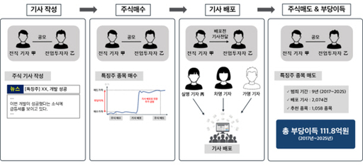 전직 기자가 9년간 '특징주 기사'를 악용해 111억 원대 부당이득을 챙긴 사건이 금융감독원 특별사법경찰(특사경) 수사로 드러났다. 기사 한 줄이 시장을 즉시 움직이는 구조를 정교하게 이용해 일반투자자에게 고의적 피해를 떠넘긴 것으로, 자본시장 신뢰를 정면으로 훼손한 중대 범죄로 평가된다.