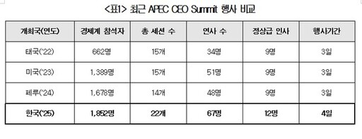 참석자 규모는 역대 최고치를 경신했다. 전체 참가자는 총 2224명으로, 이 가운데 경제계에서는 713개 기업에서 1852명이 참여했다. 이는 지난해 페루 행사보다 약 200명, 2년 전 미국 행사보다 460명가량 늘어난 수준이다. 각국 정부 및 공공부문에서도 372명이 참석했으며, 12명의 정상급 인사가 직접 연단에 올라 글로벌 경제협력 구상을 공유했다.