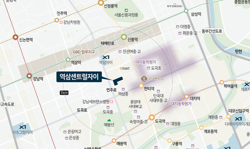 역삼센트럴자이는 지하철 수인분당선 한티역과 2호선·수인분당선 환승역인 선릉역을 도보로 이용할 수 있다. 교육환경은 반경 550m 내에 도곡초교, 반경 1㎞ 내에는 역삼중, 도곡중, 단국대사대부중·고, 진선여중·고 등이 위치해있다. 대치동 학원가 역시 도보권이다. 이마트 역삼점, 롯데백화점 강남점, 롯데시네마 도곡점 등 쇼핑·문화시설도 모두 걸어서 이용할 수 있다.