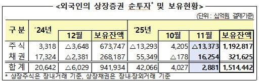 금감원은 "외국인은 11월 국내 주식시장에서 순매도로 전환해 보유 잔액이 감소했지만, 채권은 순투자로 돌아서며 한 달 만에 증가세를 보였다"고 설명했다.