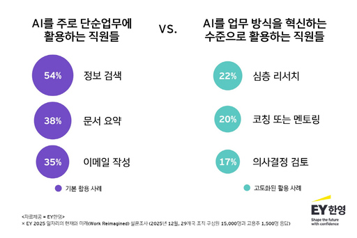 글로벌 회계·컨설팅 법인 EY한영은 16일 이 같은 내용을 담은 'EY 2025 일자리의 현재와 미래(EY Work Reimagined 2025)' 설문조사 주요 결과를 발표했다. 이번 조사는 29개국 직원 1만5000명과 경영진 1500명을 대상으로 AI 도입 수준과 인재 전략, 조직 문화 등을 종합적으로 분석했다.