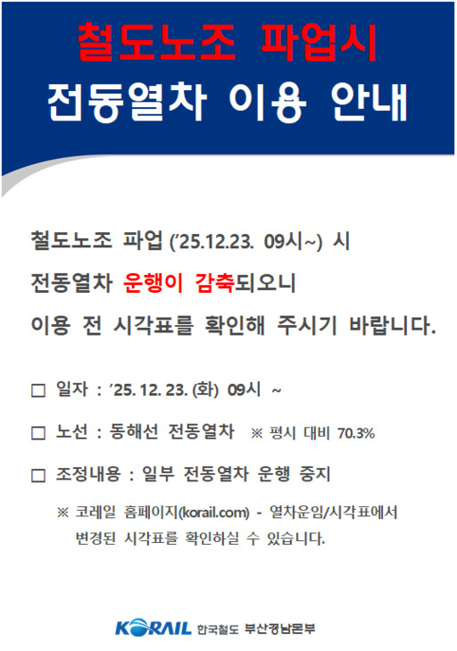 코레일 부산경남본부 관계자는 "파업 기간 열차 운행 중지 및 지연이 발생할 수 있는 만큼 코레일톡 앱, 코레일 홈페이지 문자 안내 등을 통해 열차 운행 정보를 반드시 확인해 줄 것"을 당부했다.
