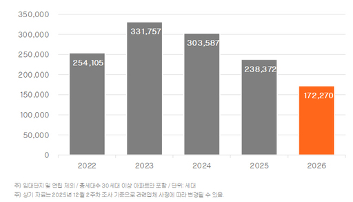 22일 직방에 따르면 2026년 전국 아파트 입주물량은 총 17만2270세대로 집계됐다. 이는 올해(23만8372세대)보다 28% 감소한 수치다.