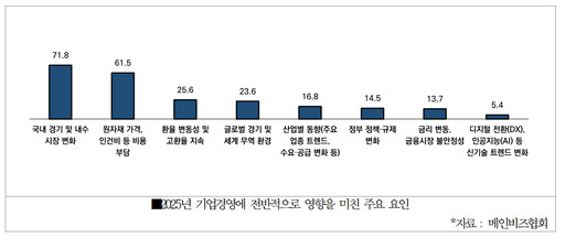 한국경영혁신중소기업협회(메이비즈협회) 조사에 따르면 올해 경영에 영향을 미친 주요 요인(복수응답)으로 '국내 경기 및 내수 시장 변화'(71.8%)에 이어 '원자재 가격, 인건비 등 비용 부담'(61.5%)과 '환율 변동성 및 고환율 지속'(25.6%)을 꼽았다.