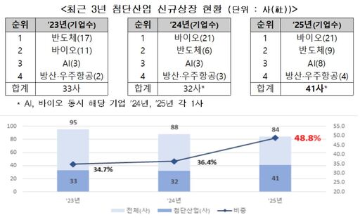 업종별로는 ABCD(인공지능·바이오·반도체·방산) 기업 비중이 확대됐다. 올해 첨단산업 신규 상장은 41사로 최근 3년 중 가장 많았고, 바이오(21사), 반도체(9사), AI(8사), 방산·우주항공(4사) 순으로 나타났다. AI 기업은 응용서비스(API) 중심으로 상장이 늘었고, 바이오는 2년 연속 20사 이상이 상장하며 대형 바이오텍과 신약개발 기업의 존재감이 부각됐다.