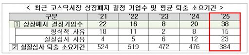 한편 올해 코스닥시장의 상장폐지 결정 기업은 38사로 최근 3년 평균 대비 약 2.5배 늘었다. 형식 사유에 따른 상장폐지는 15사, 실질 사유는 23사로 집계됐다. 거래소는 부실기업 퇴출을 확대하는 동시에, 절차 효율화를 통해 심사 기간을 단축했다고 설명했다.
